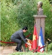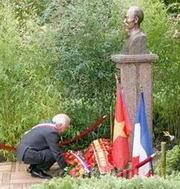 Thủ tướng Nguyễn Tấn Dũng và Thị trưởng thành phố Montreuil đặt hoa trước Tượng đài Bác Hồ trong Công viên Montreau