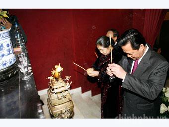 Thủ tướng Nguyễn Tấn Dũng và Phu nhân thắp hương tại Ban thờ Hồ Chủ tịch trong Đại sứ quán Việt Nam tại Pháp và nói chuyện với đông đảo cán bộ, nhân viên công tác ở sứ quán và đồng bào Việt Nam đang công tác, học tập, làm ăn, sinh sống tại Pháp.