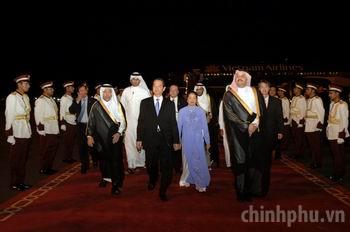Ra sân bay Doha đón đoàn có Bộ trưởng phụ trách Hợp tác quốc tế Nhà nước Qatar, Tiến sỹ Khalid bin Mohametd Al-Attiyah và một số quan chức Nhà nước Qatar; đại diện cộng đồng người Việt Nam cùng đông đảo cán bộ, nhân viên Đại sứ quán Việt Nam tại Qatar