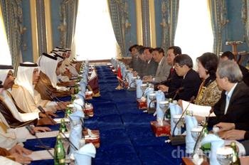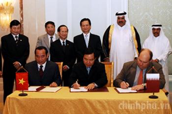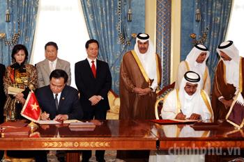 Chứng kiễn lễ ký kết Hiệp định khuyến khích và bảo hộ đầu tư giữa Phó Thủ tướng Việt Nam Phạm Gia Khiêm với Bộ trưởng Bộ Kinh doanh và Thương mại Qatar Fahad Bin Jassim Bin Mohammed Al-Thani