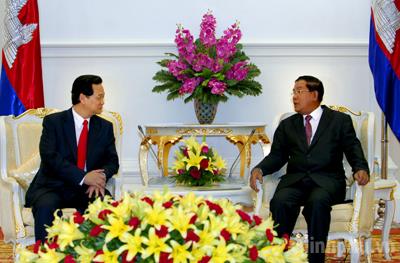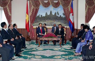 Chiều 23/4, tại Cung Hòa Bình, thủ đô Phnom Penh, Thủ tướng Nguyễn Tấn Dũng đã hội đàm với Thủ tướng Campuchia Samdech Hunsen.