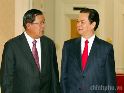 Hai Thủ tướng vui mừng nhận thấy mối quan hệ đoàn kết, hữu nghị, hợp tác giữa hai nước Việt Nam - Campuchia tiếp tục phát triển nhanh chóng trên tất cả các lĩnh vực cả về chiều rộng lẫn chiều sâu.