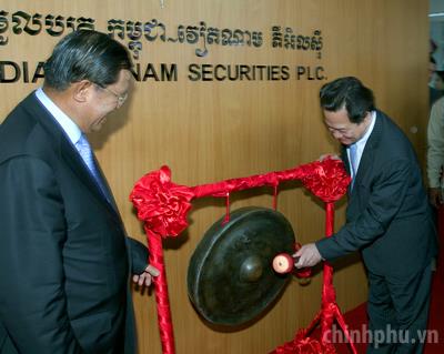 Thủ tướng Nguyễn Tấn Dũng và Thủ tướng Campuchia Samdech Techo Hunsen đã cắt băng khai trương Công ty chứng khoán Việt Nam – Campuchia (CVS). Trong ảnh: Thủ tướng Nguyễn Tấn Dũng đánh cồng khai trương sàn chứng khoán CVS