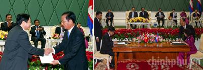 Hai Thủ tướng chứng kiến Lễ ký văn bản hợp tác Hàng không giữa Việt Nam và Campuchia, Lễ ký kết Bản ghi nhớ giữa Chính phủ Việt Nam và Chính phủ Hoàng gia Campuchia về việc điều chỉnh đường biên giới.