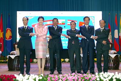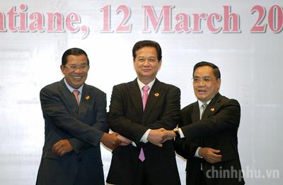 Thủ tướng Chính phủ Vương quốc Campuchia Hun Sen, Thủ tướng Chính phủ nước CHXHCN Việt Nam Nguyễn Tấn Dũng, Thủ tướng Chính phủ nước CHDCND Lào Thongsing Thammavong. (ảnh từ trái qua phải)