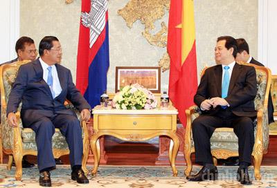 Nhân dịp dự các Hội nghị cấp cao tại thủ đô Vientiane, Lào, Thủ tướng Nguyễn Tấn Dũng đã có cuộc tiếp xúc song phương với Thủ tướng Chính phủ Vương quốc Campuchia Hun Sen
