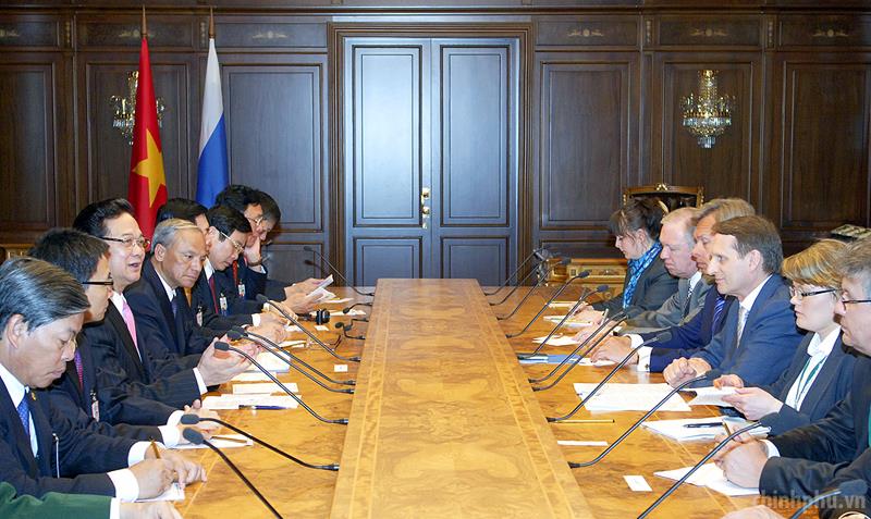 (Chinhphu.vn) - Chuyến thăm chính thức Liên bang Nga của Thủ tướng Chính phủ Nguyễn Tấn Dũng diễn ra từ ngày 12-15/5 đã thành công tốt đẹp. Trong khuôn khổ chuyến thăm chính thức LB Nga, Thủ tướng Nguyễn Tấn Dũng đã hội kiến với Tổng thống Liên bang Nga V. Putin; Hội đàm với Thủ tướng Liên bang Nga D.Medvedev và Hội kiến Chủ tịch Duma Quốc gia S. Naryshkin.