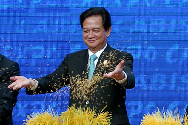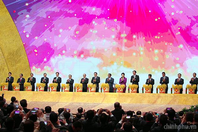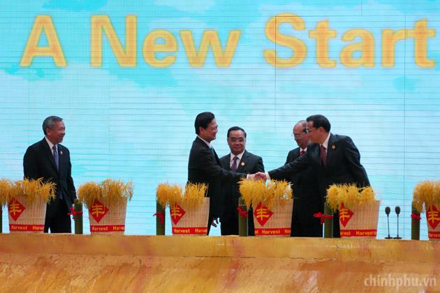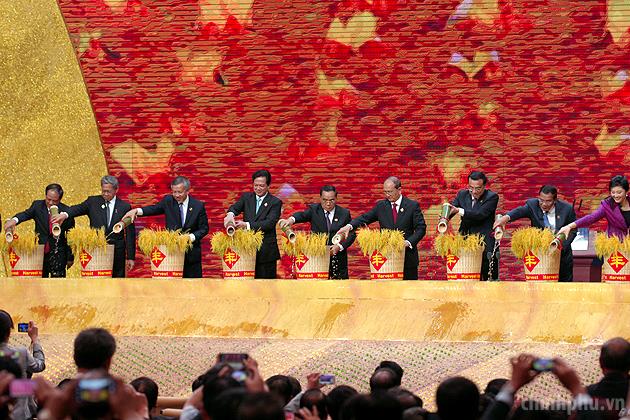 Các nhà lãnh đạo ASEAN và Trung Quốc thực hiện nghi thức gieo thóc trong lễ khai mạc Hội chợ, Hội nghị thượng đỉnh Thương mại-Đầu tư ASEAN-Trung Quốc. Ảnh: VGP/Nhật Bắc