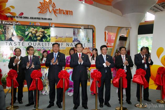 Thủ tướng cắt băng khai mạc triển lãm tại khu gian hàng Việt Nam tham gia Hội chợ triển lãm ASEAN-Trung Quốc. Ảnh: VGP/Nhật Bắc