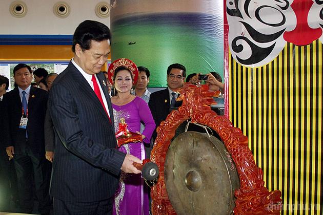 Thủ tướng đánh cồng khai trương khu gian hàng Việt Nam. Ảnh: VGP/Nhật Bắc