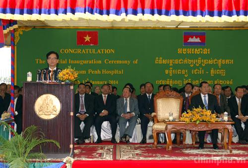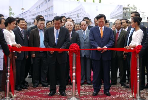 Thủ tướng Nguyễn Tấn Dũng và Thủ tướng Hun Sen đã tới dự Lễ khánh thành Bệnh viện Chợ Rẫy-Phnom Penh, công trình đầu tiên về hợp tác đầu tư giữa Việt Nam và Campuchia trong lĩnh vực y tế. Ảnh: VGP/Nhật Bắc