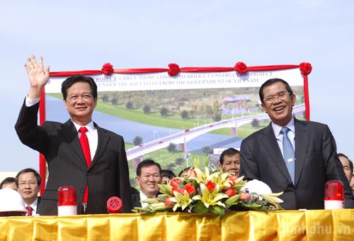 Thủ tướng Nguyễn Tấn Dũng và Thủ tướng Hunsen dự Lễ khởi công Dự án cầu Long Bình-Chrey Thom, cây cầu nối liền tỉnh An Giang (Việt Nam) với tỉnh Kandal (Campuchia). Ảnh: VGP/Nhật Bắc
