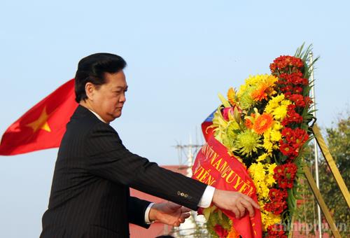 Thủ tướng Nguyễn Tấn Dũng đặt vòng hoa tại Đài tưởng niệm nhân kỷ niệm 35 năm Ngày Chiến thắng chiến tranh bảo vệ biên giới Tây-Nam và cùng quân dân Campuchia chiến thắng chế độ diệt chủng (7/1/1979-7/1/2014). Ảnh: VGP/Nhật Bắc
