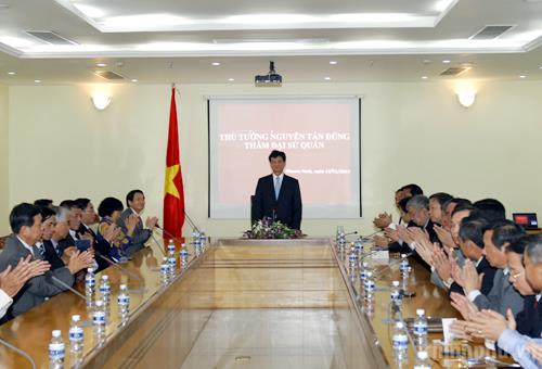 Thủ tướng Nguyễn Tấn Dũng thăm và nói chuyện với cán bộ nhân viên Đại sứ quán Việt Nam tại Campuchia. Ảnh: VGP/Nhật Bắc