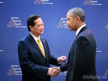 Chiều 24/3 (giờ địa phương), ngay trước phiên khai mạc Hội nghị Thượng đỉnh An ninh hạt nhân lần thứ 3 tại Hà Lan, Thủ tướng đã gặp gỡ Tổng thống Hoa Kỳ Barack Obama. Ảnh: TTXVN