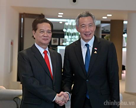 Thủ tướng Nguyễn Tấn Dũng và Thủ tướng Singapore Lý Hiển Long nhất trí rằng quan hệ hai nước đang ở vào thời điểm rất thuận lợi, hội tụ đủ những yếu tố để phát triển mạnh mẽ hơn bao giờ hết. Ảnh: TTXVN
