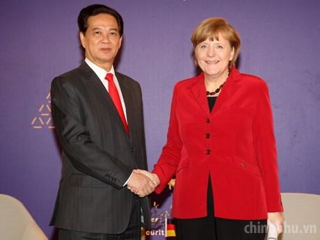 Thủ tướng Nguyễn Tấn Dũng và Thủ tướng Đức Angela Merkel bày tỏ vui mừng nhận thấy quan hệ đối tác chiến lược giữa Việt Nam và Đức đang phát triển sâu rộng và hiệu quả trong nhiều lĩnh vực. Ảnh: TTXVN
