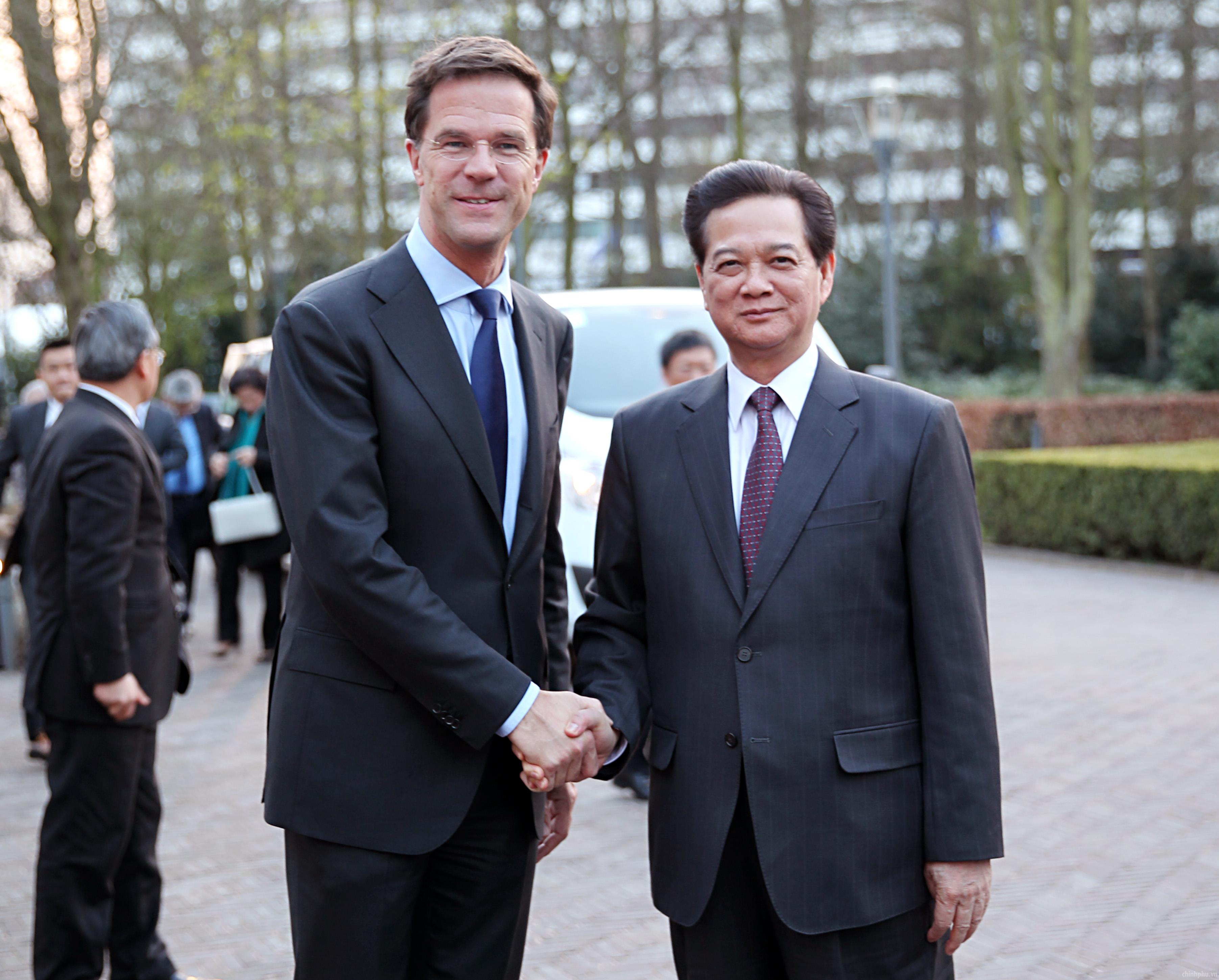 Thủ tướng Nguyễn Tấn Dũng chúc mừng Thủ tướng Hà Lan Mark Rutte đã chủ trì Hội nghị Thượng đỉnh An ninh Hạt nhân thành công tốt đẹp. Thủ tướng Mark Rutte đánh giá cao sự tham gia tích cực và hiệu quả của Việt Nam tại Hội nghị. Ảnh: VGP/Nhật Bắc