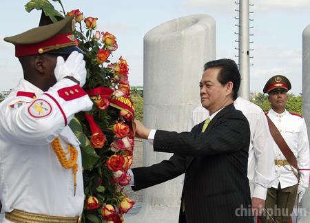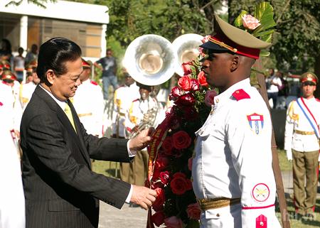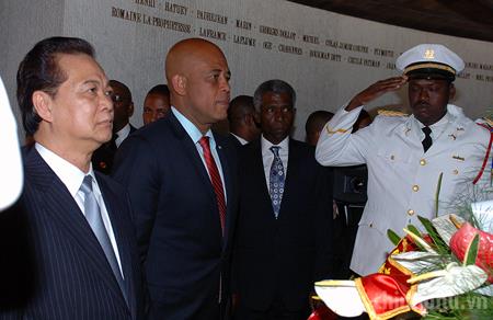 Thủ tướng Nguyễn Tấn Dũng cùng Tổng thống Michel Joseph Martelly đặt vòng hoa tại Đài tưởng niệm các anh hùng dân tộc Haiti. Ảnh: VGP/Nhật Bắc