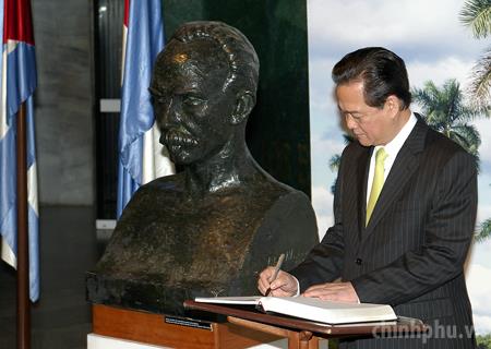 Thủ tướng lưu bút trong sổ ghi cảm tưởng tại Nhà tưởng niệm Anh hùng dân tộc Cuba Jose Marti. Ảnh: VGP/Nhật Bắc