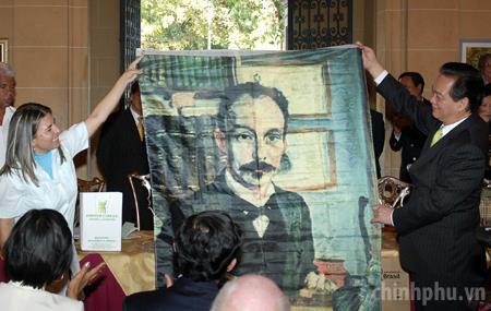 Hội hữu nghị Cuba-Việt Nam tặng Thủ tướng bức tranh về người Anh hùng dân tộc Cuba Jose Marti. Ảnh: VGP/Nhật Bắc