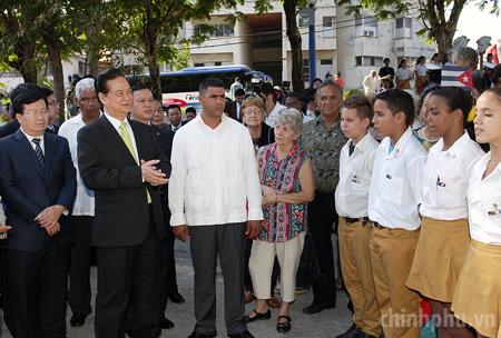 Thủ tướng vỗ tay theo nhịp bài hát ca ngợi Chủ tịch Hồ Chí Minh do các cháu thiếu nhi Cuba thể hiện. Ảnh: VGP/Nhật Bắc