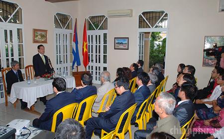 Thủ tướng nói chuyện với cán bộ, nhân viên Đại sứ quán Việt Nam tại Cuba. Ảnh: VGP/Nhật Bắc