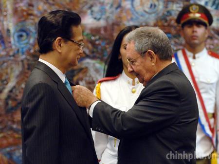 Chủ tịch Raul Castro Ruz trao tặng Thủ tướng Huân chương Jose Marti. Ảnh: VGP/Nhật Bắc