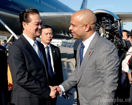 Sáng 28/3 (giờ địa phương), Thủ tướng Haiti và các quan chức đón Thủ tướng Nguyễn Tấn Dũng tại sân bay. Ảnh VGP/Nhật Bắc