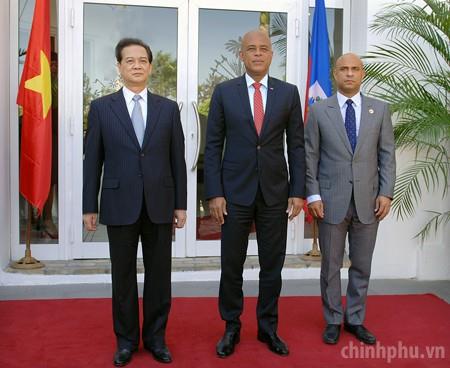 Tổng thống Haiti Michel Joseph Martelly (giữa) và Thủ tướng Haiti Laurent Salvador Lamothe chủ trì lễ đón trọng thể Thủ tướng Nguyễn Tấn Dũng tại Phủ Tổng thống ở Thủ đô Port-au-Prince. Ảnh: VGP/Nhật Bắc