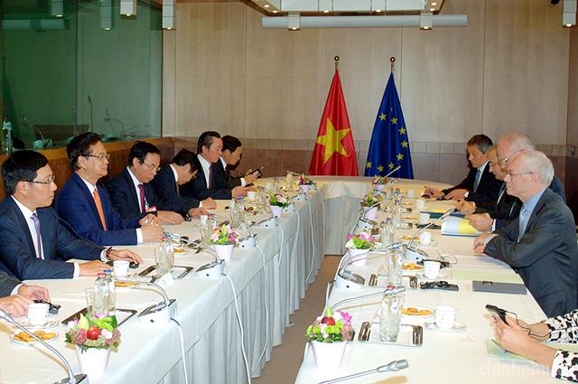 Buổi làm việc giữa đoàn cấp cao Việt Nam với Chủ tịch Hội đồng châu Âu. Ảnh: VGP/Nhật Bắc