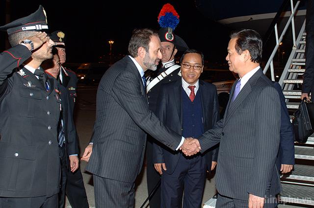 Đại diện Bộ Ngoại giao Italy; cán bộ, nhân viên Đại sứ quán Việt Nam tại Italy đón Thủ tướng Nguyễn Tấn Dũng. Ảnh: VGP/Nhật Bắc