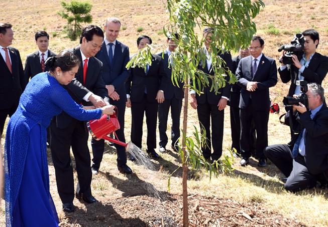 Thủ tướng Nguyễn Tấn Dũng và Phu nhân tham dự lễ trồng cây tại Vườn ươm quốc gia ở Canberra. Ảnh: VGP/Nhật Bắc