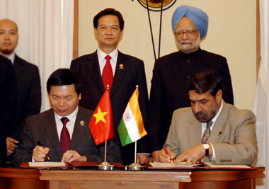 | | | Thủ tướng Nguyễn Tấn Dũng và Thủ tướng Ấn Độ Manmohan Singh - Ảnh: Chinhphu.vn | Ngày 25/10/2009, trong thời gian tham dự Hội nghị cấp cao Đông Á, Thủ tướng Chính phủ Nguyễn Tấn Dũng đã có cuộc gặp với Thủ tướng Ấn Độ Manmohan Singh. Hai Thủ tướng hài lòng nhận thấy quan hệ đối tác chiến lược Việt Nam - Ấn Độ phát triển tốt đẹp trên nhiều lĩnh vực. Thủ tướng Nguyễn Tấn Dũng đánh giá cao hợp tác với Ấn Độ trên các lĩnh vực kinh tế, chuyển giao thiết bị, công nghệ và giáo dục đào tạo; đề nghị hai bên tiếp tục thúc đẩy triển khai các cơ chế hợp tác sẵn có và thiết lập các cơ chế hợp tác mới. Thủ tướng Manmohan Singh khẳng định Chính phủ và nhân dân Ấn Độ luôn có tình cảm sâu đậm với Việt Nam và coi trọng quan hệ đối tác chiến lược Việt Nam - Ấn Độ. Giới doanh nghiệp Ấn Độ cũng rất quan tâm đến hợp tác kinh doanh và đầu tư tại Việt Nam. Chuyến thăm Ấn Độ sắp tới của Chủ tịch nước Nguyễn Minh Triết và Chủ tịch Quốc hội Nguyễn Phú Trọng sẽ góp phần làm sâu sắc hơn nữa quan hệ đối tác chiến lược Việt Nam - Ấn Độ. Thủ tướng Manmohan Singh cho rằng hai bên cần nỗ lực thúc đẩy hơn nữa hợp tác thực chất và hiệu quả trên các lĩnh vực thương mại, đầu tư, quốc phòng và an ninh. Sau khi ký kết Hiệp định thương mại tự do (FTA) về hàng hóa, Ấn Độ sẵn sàng tiếp tục đàm phán Hiệp định FTA về dịch vụ và đầu tư với ASEAN. Ấn Độ cũng đánh giá cao việc Việt Nam đảm nhận cương vị Chủ tịch ASEAN năm 2010 và hy vọng Việt Nam sẽ hỗ trợ thúc đẩy quan hệ giữa Ấn Độ với ASEAN ngày càng phát triển. | | | Hai Thủ tướng chứng kiến Lễ ký kết Biên bản Ghi nhớ về việc Ấn Độ công nhận Việt Nam là nền kinh tế thị trường đầy đủ - Ảnh: Chinhphu.vn | Ngay sau cuộc gặp, hai Thủ tướng đã chứng kiến Lễ ký kết Biên bản Ghi nhớ về việc Ấn Độ công nhận Việt Nam là nền kinh tế thị trường đầy đủ. Việt Đông Ảnh: Nhật Bắc |