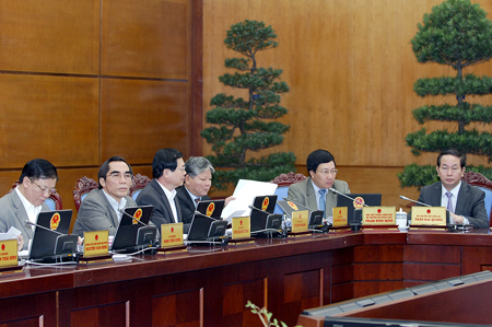 Thủ tướng Nguyễn Tấn Dũng và các Phó Thủ tướng: Nguyễn Xuân Phúc, Hoàng Trung Hải, Vũ Đức Đam, Phạm Bình Minh và Bộ trưởng Bộ Công an Trần Đại Quang trong phiên họp Chính phủ thường kỳ tháng 11/2013. Ảnh: VGP/Nhật Bắc