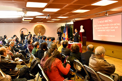 Thủ tướng Chính phủ Nguyễn Tấn Dũng gặp gỡ và nói chuyện thân mật với đại diện cộng đồng người Việt và cán bộ, nhân viên Đại sứ quán Việt Nam tại Cộng hòa Pháp.