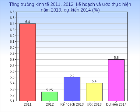 Thứ hai, tốc độ tăng trưởng ước năm 2013 cao hơn tốc độ tăng của năm 2012 (5,4% so với tăng 5,25%). Theo đó, tuy về chỉ tiêu thì không đạt kế hoạch (tăng 5,4% so với tăng 5,5%), nhưng nếu so với mục tiêu tổng quát mà Quốc hội đề ra (là tăng trưởng cao hơn) thì có thể được coi là đạt.