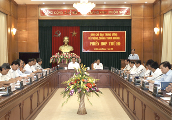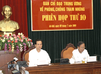 |  | | Thủ tướng Chính phủ Nguyễn Tấn Dũng phát biểu chỉ đạo Phiên họp - Ảnh: Chinhphu.vn | Sáng 8/7, Ban Chỉ đạo Trung ương về phòng, chống tham nhũng (Ban Chỉ đạo) đã họp Phiên thứ 10 nhằm đánh giá kết quả công tác phòng, chống tham nhũng 6 tháng đầu năm 2009 và chỉ đạo nhiệm vụ 6 tháng cuối năm 2009. Thủ tướng Chính phủ Nguyễn Tấn Dũng, Trưởng Ban Chỉ đạo; Phó Thủ tướng Chính phủ Trương Vĩnh Trọng, Phó Trưởng Ban Chỉ đạo đồng chủ trì Phiên họp. Thủ tướng Nguyễn Tấn Dũng ghi nhận những kết quả tích cực của công tác phòng, chống tham nhũng trong thời gian qua, đồng thời cũng chỉ ra những tồn tại, hạn chế của công tác này như việc tổ chức thực hiện các quy định về phòng ngừa tham nhũng ở lĩnh vực kê khai tài sản, quản lý đất đai hiệu quả còn thấp; công tác phát hiện, xử lý các vụ việc tham nhũng còn bất cập; việc xử lý trách nhiệm người đúng đầu tại các đơn vị xảy ra tham nhũng còn hạn chế… Theo Thủ tướng Nguyễn Tấn Dũng, trong thời gian tới các cấp, Bộ, ngành, địa phương cần coi việc tiếp tục đẩy mạnh công tác tuyên truyền, giáo dục về phòng, chống tham nhũng, gắn với thực hiện Cuộc vận động “Học tập và làm theo tấm gương đạo đức Hồ Chí Minh” là một nhiệm vụ trọng tâm. Đẩy mạnh công tác kiểm tra, kiểm toán, thanh tra, điều tra, xét xử và phối hợp giữa các cơ quan chức năng trong việc phát hiện và xử lý các vụ việc tham nhũng, tiêu cực. Phát huy tối đa vai trò giám sát của nhân dân, các tổ chức quần chúng đối với những lĩnh vực dễ xảy ra tham nhũng, tiêu cực như quản lý, sử dụng đất đai, tài sản công, đầu tư, xây dựng, quản lý tài nguyên. Ban Chỉ đạo phối hợp cùng các cơ quan chức năng tiếp tục chỉ đạo hoàn thiện các đề án và ban hành các văn bản nhằm hoàn thiện thể chế về phòng chống tham nhũng. Trong đó lưu ý tới các văn bản về phòng ngừa tham nhũng, coi phòng tham nhũng là một giải pháp hiệu quả góp phần tích cực vào công tác đấu tranh chống tham nhũng… Thủ tướng Nguyễn Tấn Dũng yêu cầu. Nâng cao năng lực, chất lượng hoạt động của Ban Chỉ đạo phòng, chống tham nhũng các cấp và các đơn vị chuyên trách chống tham nhũng. Trong đó, đặc biệt lưu ý tới yếu tố về phẩm chất đạo đức, trình độ nghiệp vụ, chuyên môn của cán bộ làm công tác này. Tuyệt đối không để xảy ra tình trạng “những người làm công tác phòng, chống tham nhũng lại có hành vi tham nhũng, nhận hối lộ”, Thủ tướng Nguyễn Tấn Dũng nhấn mạnh. Thủ tướng Nguyễn Tấn Dũng cũng yêu cầu, Ban Chỉ đạo cần làm tốt hơn nữa công tác thông tin tuyên truyền cho báo chí về các vụ án, vụ việc tham nhũng, tránh tình trạng các cơ quan báo chí không có đầy đủ thông tin dẫn tới các bài viết sai lệch, khiến dư luận hiểu lầm. Đối với 8 vụ án trọng điểm, Thủ tướng Nguyễn Tấn Dũng đánh giá cao nỗ lực của các cơ quan chức năng trong tiến độ xử lý các vụ việc; cho rằng các vụ án này đã xử đúng người, đúng tội, được dư luận đồng tình ủng hộ. Một số phần việc còn lại trong 8 vụ án trọng điểm này, Thủ tướng yêu cầu các cơ quan tích cực xử lý trong thời gian sớm nhất cũng như việc sớm đưa ra xét xử các vụ án còn lại trong số 17 vụ án tham nhũng khác mà Ban Chỉ đạo đang theo dõi, chỉ đạo. |  | | Thủ tướng Chính phủ Nguyễn Tấn Dũng, Phó Thủ tướng Chính phủ Trương Vĩnh Trọng chủ trì Phiên họp thứ 10 của Ban Chỉ đạo Trung ương về phòng, chống tham nhũng - Ảnh: Chinhphu.vn | Tiến độ, chất lượng xử lý các vụ án tham nhũng đã được nâng lên Trong 6 tháng đầu năm, công tác giám sát, kiểm tra, kiểm toán, thanh tra, điều tra, truy tố, xét xử được tăng cường. Tiến độ, chất lượng xử lý các vụ án tham nhũng đã được nâng lên; cơ bản xử lý xong các vụ án trọng điểm; nhiều vụ việc, vụ án tham nhũng được phát hiện và đưa ra xét xử; một số vụ việc, vụ án tham nhũng tồn đọng, kéo dài được giải quyết dứt điểm. Thanh tra Chính phủ đã ban hành 8 kết luận thanh tra; phát hiện giá trị sai phạm trên 11.100 tỷ đồng, gần 150.000 USD và 21.500 cổ phần (cổ phần của Công ty Y dược phẩm Vimedimex), các sai phạm chủ yếu là hạch toán sai, lãng phí, thất thoát…; kiến nghị thu hồi về ngân sách Nhà nước 1.164 tỷ đồng, gần 150.000 USD và 21.500 cổ phần; đề nghị xử lý hành chính đối với 11 tập thể, 24 cá nhân và kiến nghị chuyển cơ quan điều tra tiếp tục làm rõ 3 vụ việc. Bên cạnh đó, Thanh tra các Bộ, ngành và địa phương đã triển khai 6.909 cuộc thanh tra, kết thúc trên 5.000 cuộc, phát hiện sai phạm gần 9.150 tỷ đồng, trên 8.247.900 m 2 đất; kiến nghị thu hồi về cho nhà nước 430.490 triệu đồng, 6.053.103 m 2 đất; kiến nghị xử lý hành chính 275 tập thể, trên 1.000 cá nhân, chuyển cơ quan điều tra xử lý hình sự 26 vụ việc, 33 người. |  | | Phiên họp thứ 10 của Ban Chỉ đạo Trung ươn