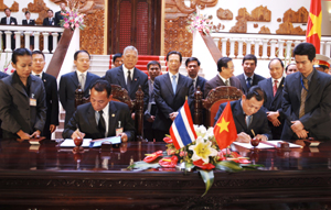 | | Thủ tướng Nguyễn Tấn Dũng và Thủ tướng Thái Lan Samak Sundaravej duyệt đội danh dự - Ảnh Website Chính phủ | Việt Nam - Thái Lan tiếp tục duy trì, phát triển quan hệ hữu nghị, hợp tác, đặc biệt là hợp tác kinh tế, thương mại, đầu tư. Kim ngạch thương mại song phương Việt Nam-Thái Lan tăng trưởng nhanh qua các năm, đạt gần 4,8 tỷ USD năm 2007, tăng 21,3% so với năm 2006. Thái Lan hiện là thị trường nhập khẩu quan trọng thứ 6 của Việt Nam trên thế giới, thứ 2 trong khối ASEAN. Hiện tổng giá trị đầu tư của Thái Lan vào Việt Nam khoảng 1,67 tỷ USD, đứng thứ 13 trong số các quốc gia và vùng lãnh thổ đầu tư vào Việt Nam. Tại cuộc hội đàm, hai Thủ tướng bày tỏ hài lòng về sự phát triển tốt đẹp của quan hệ hữu nghị và hợp tác giữa hai nước trong thời gian qua. Thủ tướng Nguyễn Tấn Dũng chúc mừng Ngài Samak Sundaravej nhân dịp mới được bổ nhiệm làm Thủ tướng Thái Lan; khẳng định chính sách nhất quán của Việt Nam luôn coi trọng củng cố và phát triển quan hệ hữu nghị và hợp tác với Thái Lan. Hai bên cũng trao đổi một số phương hướng hợp tác về chính trị, an ninh, thương mại và đầu tư. Hai bên nhất trí thúc đẩy cơ chế tư vấn cấp Bộ trưởng Ngoại giao hai nước (JCM) và Chiến lược hợp tác Kinh tế chung (JSEP). Hai bên cũng cam kết tăng cường hợp tác về giao thông vận tải, y tế, về sản xuất gạo, cao su và nuôi tôm. Về thương mại, hai bên nhất trí phấn đấu tăng kim ngạch thương mại lên gấp đôi hiện nay, khoảng 10 tỷ USD vào năm 2010.  | | Hai Thủ tướng chứng kiến Lễ ký Hiệp định - Ảnh Website Chính phủ | Hai bên cũng nhất trí sẽ tạo thuận lợi cho các tập đoàn doanh nghiệp lớn của Thái Lan sang Việt Nam tìm hiểu cơ hội kinh doanh và đầu tư trong thời gian tới. Thủ tướng Thái Lan khẳng định không cho phép bất kỳ cá nhân, tổ chức nào sử dụng lãnh thổ Thái Lan chống lại Việt Nam và sẽ tiếp tục tạo điều kiện thuận lợi cho bà con Việt kiều sinh sống tại Thái Lan. Hai bên cũng trao đổi một số vấn đề khu vực và quốc tế cùng quan tâm, trong đó có hợp tác ACMECS (Tổ chức Chiến lược Hợp tác Kinh tế ba dòng sông chính ở Đông Nam Á), hợp tác Tiểu vùng Mê Kông mở rộng (GMS). Thái Lan đề nghị Việt Nam ủng hộ Thái Lan trở thành Ủy viên không thường trực Hội đồng Bảo an Liên Hợp Quốc khóa tới. Ngay sau Hội đàm, hai Thủ tướng đã chứng kiến Lễ ký “Hiệp định song phương nhằm loại trừ nạn buôn bán người, đặc biệt là Phụ nữ và Trẻ em và giúp đỡ nạn nhân bị buôn bán”. Đức Tuân - Nguyễn Hoàng |