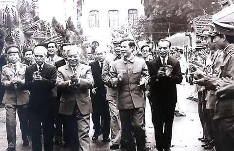 Đồng chí Phạm Hùng cùng lãnh đạo Bộ Công an đến thăm và chúc Tết cán bộ, chiến sĩ Công an Hà Nội (Xuân Quí Hợi - 1983). Ảnh tư liệu
