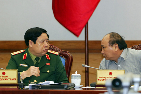 Phó Thủ tướng Nguyễn Xuân Phúc trao đổi với Đại tướng Phùng Quang Thanh, Bộ trưởng Bộ Quốc phòng. Ảnh: VGP/Nhật Bắc