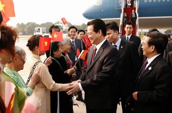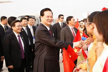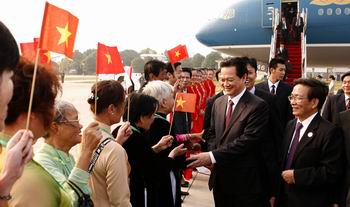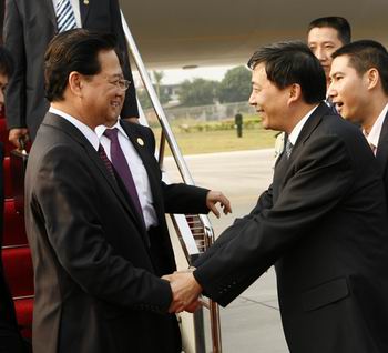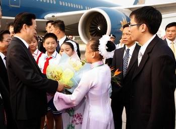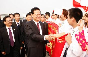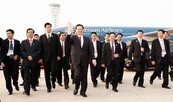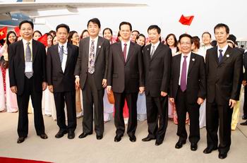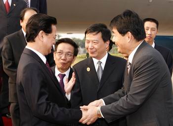 Những người bạn Trung Quốc và đồng bào Việt Nam đang công tác, học tập, làm ăn sinh sống tại thành phố Nam Ninh (Quảng Tây) nồng nhiệt chào đón Thủ tướng Nguyễn Tấn Dũng và Đoàn cấp cao Chính phủ Việt Nam.