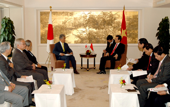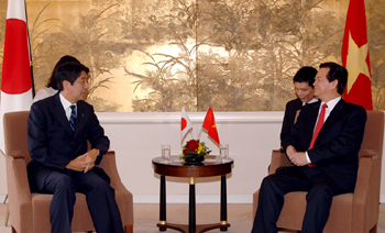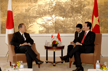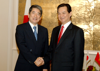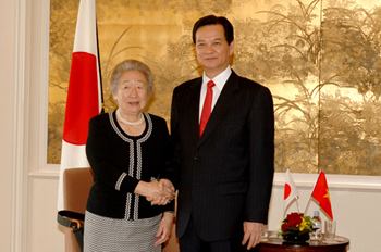 |  | | Thủ tướng Nguyễn Tấn Dũng và cựu Thủ tướng Shinzo Abe - Ảnh: Chinhphu.vn | Thủ tướng Nguyễn Tấn Dũng tiếp ngài Shinzo Abe Trong bầu không khí thân mật, Thủ tướng Nguyễn Tấn Dũng vui mừng gặp lại ngài Shinzo Abe, nhấn mạnh Việt Nam luôn coi ngài Shinzo Abe là người bạn thân thiết, có nhiều đóng góp quan trọng cho tiến trình xây dựng mối quan hệ đối tác chiến lược vì hòa bình và phồn vinh ở châu Á giữa hai nước. Thủ tướng thông báo cuộc hội đàm thành công với Thủ tướng Taro Aso và bày tỏ mong muốn ngài Shinzo Abe, trên cương vị của mình, tiếp đóng góp hơn nữa để đưa quan hệ hai nước lên tầm cao mới, nhất là đề nghị Quốc hội Nhật Bản sớm phê chuẩn Hiệp định đối tác kinh tế Việt – Nhật để Hiệp định sớm có hiệu lực và đi vào cuộc sống nhằm tạo môi trường thuận lợi, công bằng và bình đẳng trong quan hệ kinh tế giữa hai nước; tăng viện trợ phát triển chính thức (ODA) cho Việt Nam và thúc đẩy triển khai thực hiện 3 dự án có qui mô lớn: Đường cao tốc Bắc-Nam, đường sắt cao tốc Bắc – Nam, Khu công nghệ cao Hòa Lạc, cũng như một số dự án quan trọng khác. Ngài Shinzo Abe cảm ơn những tình cảm của Chính phủ và nhân dân Việt Nam dành cho ông, khẳng định sẽ phát huy vai trò của mình thúc đẩy Quốc hội Nhật Bản sớm hoàn tất các thủ tục phê chuẩn Hiệp định đối tác kinh tế Việt – Nhật, tăng viện trợ phát triển chính thức (ODA) cho Việt Nam, cũng như thực hiện các dự án quan trọng nêu trên. Đẩy mạnh hợp tác giữa các tổ chức kinh tế Nhật Bản với Việt Nam |  | | Thủ tướng Nguyễn Tấn Dũng và bà Sadako Ogata, lãnh đạo Tổ chức Hợp tác quốc tế Nhật Bản - Ảnh: Chinhphu.vn | Tiếp lãnh đạo Tổ chức Hợp tác quốc tế Nhật Bản (JICA), Tổ chức Xúc tiến Thương mại hải ngoại Nhật Bản (JETRO), Thủ tướng Nguyễn Tấn Dũng cảm ơn sự hỗ trợ và hợp tác của JICA trong triển khai các dự án xây dựng cơ sở hạ tầng, cải thiện môi trường sống, thu hẹp khoảng cách phát triển, tăng cường quản lý nhà nước…tích cực ủng hộ và góp phần quan trọng trong việc Chính phủ Nhật Bản quyết định nối lại vốn vay ODA cho Việt Nam, mong muốn JICA tiếp tục ủng hộ và hỗ trợ có hiệu quả nhằm thúc đẩy tiến độ triển khai các dự án ODA ở Việt Nam, đặc biệt là 3 dự án quan trọng là đường bộ cao tốc Bắc - Nam, đường sắt cao tốc Bắc - Nam và Khu công nghệ cao Hòa Lạc. |  | | Thủ tướng Nguyễn Tấn Dũng và ông Yasuo Hayashi, lãnh đạo Tổ chức Xúc tiến Thương mại hải ngoại Nhật Bản - Ảnh: Chinhphu.vn | Thủ tướng đánh giá cao vai trò của JETRO trong những năm vừa qua và hiện nay, đã và đang tích cực kêu gọi các doanh nghiệp Nhật Bản tăng cường đầu tư vào Việt Nam, tổ chức nhiều hoạt động rất thiết thực nhằm thúc đẩy phát triển mạnh mẽ quan hệ kinh tế - thương mại giữa hai nước. Thủ tướng cho rằng, đã có sự đóng góp quan trọng JETRO để quan hệ kinh tế - thương mại giữa hai nước ngày càng phát triển mạnh mẽ, năm 2008 lên 15 tỷ USD. Thủ tướng đề nghị JETRO tích cực hợp tác, thúc đẩy các doanh nghiệp của Nhật Bản đầu tư vào Việt Nam. Mong rằng với sự hỗ trợ mạnh mẽ của JETRO, sẽ có nhiều doanh nghiệp Nhật Bản đầu tư tại Khu công nghiệp Quế Võ (Bắc Ninh) và Khu công nghệ cao Hòa Lạc… |  | | Thủ tướng Nguyễn Tấn Dũng trao đổi với Chủ tịch Tổ chức Diễn đàn năng lượng hạt nhân Hattori Takuya - Ảnh: Chinhphu.vn | Trao đổi với ông Hattori Takuya, Chủ tịch Tổ chức Diễn đàn năng lượng hạt nhân và chuyên gia kinh tế Yukio Okamoto, Thủ tướng Nguyễn Tấn Dũng cho biết: Việt Nam đang trong quá trình nghiên cứu lập báo cáo đầu tư xây dựng Nhà máy điện nguyên tử đầu tiên của Việt Nam và sẽ trình Quốc hội xem xét, quyết định. Việt Nam đánh giá cao công nghệ năng lượng nguyên tử của Nhật Bản cũng như năng lực của các công ty Nhật Bản trong việc xây dựng nhà máy điện nguyên tử và coi Nhật Bản là một trong các quốc gia ưu tiên hàng đầu khi xem xét khả năng hợp tác để xây dựng nhà máy điện nguyên tử ở Việt Nam. | | | Thủ tướng Nguyễn Tấn Dũng và chuyên gia kinh tế Yukio Okamoto - Ảnh: Chinhphu.vn | Lãnh đạo JICA, JETRO và ông Hattori Takya, chuyên gia kinh tế Yukio Okamoto đều bày tỏ những ấn tượng tốt đẹp về đất nước, con người Việt Nam, sự phát triển năng động và những thành tựu hết sức ấn tượng Việt Nam đạt được trong thời kỳ đổi mới, khẳng định sẽ góp phần tích cực vào việc không ngừng củng cố và phát triển quan hệ hữu nghị hợp tác kinh tế giữa hai nước. Việt Đông – Nhật Bắc |