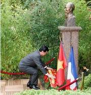 Thủ tướng Nguyễn Tấn Dũng và Thị trưởng thành phố Montreuil đặt hoa trước Tượng đài Bác Hồ trong Công viên Montreau