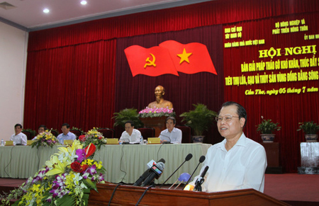 (Chinhphu.vn) - Trong cả ngày diễn ra Hội nghị bàn giải pháp tháo gỡ khó khăn, thúc đẩy sản xuất, tiêu thụ lúa, gạo và thủy sản vùng ĐBSCL năm 2013, các đại biểu đã trao đổi thẳng thắn, đề xuất trực tiếp những giải pháp để phát triển sản xuất lúa gạo, thủy sản.
