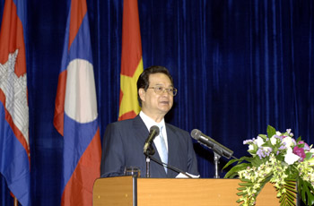 | | Ba Thủ tướng các nước CLV tại lễ khai mạc - Ảnh: Cổng TTĐT Chính phủ | Sau diễn văn khai mạc của Thủ tướng nước CHDCND Lào Bouasone Bouphavanh, Thủ tướng Campuchia Hun Sen và Thủ tướng Việt Nam Nguyễn Tấn Dũng đã phát biểu khẳng định quan hệ hữu nghị tốt đẹp, truyền thống và hợp tác hiệu quả giữa ba dân tộc anh em trong thời gian qua. V ới mục tiêu đẩy nhanh tốc độ phát triển kinh tế, thu hẹp khoảng cách phát triển giữa các nước và trong khu vực, những năm qua, sự hợp tác của CLV đã đem lại hiệu quả thiết thực trong việc phát triển kinh tế-xã hội của mỗi nước, đặc biệt là khu vực tiểu vùng sông Mêkông, đồng thời làm động lực thúc đẩy các tiểu vùng khác cùng phát triển. |  | | Thủ tướng Chính phủ Nguyễn Tấn Dũng: Tăng cường phối hợp chặt chẽ giữa ba nước CLV trong việc xây dựng Tam giác phát triển - Ảnh: Cổng TTĐT Chính phủ | Phát biểu tại lễ khai mạc, Thủ tướng Nguyễn Tấn Dũng thông báo với Thủ tướng CHDCND Lào Bouasone Bouphavanh và Thủ tướng Vương quốc Campuchia Hun Sen về những thành tựu kinh tế-xã hội của Việt Nam và bày tỏ vui mừng về mối quan hệ hợp tác hiệu quả giữa ba nước. Thủ tướng Nguyễn Tấn Dũng tin tưởng Hội nghị cấp cao 3 nước CLV lần này sẽ xây dựng được phương hướng phát triển bền vững ở khu vực Tam giác phát triển trong thời gian tới. Nam Tiến-Kim Tùng |