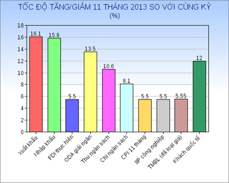 (Chinhphu.vn) - Năm 2013 chỉ còn 1 tháng nữa là kết thúc, kết quả kinh tế 11 tháng qua cho thấy việc đạt được mục tiêu của cả năm có nhiều tín hiệu khả quan, nhất là tăng trưởng kinh tế ước cả năm có thể cao hơn năm 2012 (5,4% so với 5,25%) và đạt được mục tiêu tổng quát theo Nghị quyết của Quốc hội (tăng trưởng cao hơn).