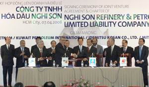 | | Thủ tướng Nguyễn Tấn Dũng tiếp Bộ trưởng Dầu mỏ Kuwait Mohammad Al-Aulaim | Tại cuộc tiếp, Thủ tướng Nguyễn Tấn Dũng cho rằng, việc Kuwait ký hợp đồng hợp tác với Tập đoàn Dầu khí quốc gia Việt Nam cho thấy những thành quả đầu tiên trong hợp tác kinh tế, thể hiện nỗ lực của Chính phủ và các doanh nghiệp hai nước trong việc thực hiện các thỏa thuận giữa các nhà lãnh đạo của Việt Nam và Kuwait. Đây không chỉ là một hợp đồng kinh tế mà còn là một hình mẫu hợp tác để hai nước có thể mở rộng hợp tác trên nhiều lĩnh vực khác. Chính phủ Việt Nam cam kết sẽ hỗ trợ hết sức để sớm triển khai các dự án hợp tác mới. Về phần mình, Bộ trưởng Dầu mỏ Kuwait bày tỏ, việc ký kết dự án hợp tác dầu khí sẽ đem lại những kinh nghiệm cho doanh nghiệp hai nước, phía Kuwait sẽ nỗ lực để cùng phía Việt Nam và đối tác Nhật Bản hoàn thành dự án này, đáp ứng sự mong đợi của Chính phủ và doanh nghiệp hai nước. Trong thời gian tới, ngoài lĩnh vực dầu khí hợp tác về dầu khí Kuwait mong muốn Việt Nam tạo điều kiện thuận lợi để các doanh nghiệp Kuwait tiếp tục mở rộng hợp tác, đầu tư sang các lĩnh vực khác như điện thoại di động, bất động sản.  | | Lễ ký kết thành lập Công ty liên doanh thực hiện Dự án Liên hợp lọc hóa dầu Nghi Sơn giữa Tập đoàn Dầu khí Việt Nam, Tập đoàn Dầu khí Quốc tế Kuwait | Sau buổi tiếp, Thủ tướng Chính phủ Nguyễn Tấn Dũng, các Phó Thủ tướng: Nguyễn Sinh Hùng, Trương Vĩnh Trọng, Hoàng Trung Hải và Bộ trưởng Dầu mỏ Kuwait Mohammad Al-Aulai đã chứng kiến Lễ ký kết thành lập Công ty liên doanh thực hiện Dự án Liên hợp lọc hóa dầu Nghi Sơn giữa Tập đoàn Dầu khí Việt Nam, Tập đoàn Dầu khí Quốc tế Kuwait (KPI), Công ty Idemitsu Kosan (IKC) và Công ty Hóa chất Mitsui (MCI) với tổng vốn đầu tư gần 6 tỉ USD. Dự kiến dự án sẽ hoàn thành vào năm 2013 và tiêu thụ 200.000 thùng mỗi ngày, tương đương 10 triệu tấn/năm. Nguyễn Hoàng |