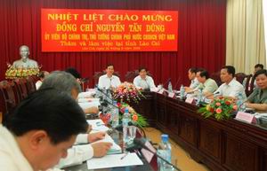 (Cổng TTĐT Chính phủ) – Lào Cai là địa phương cuối cùng trong chuyến thăm, làm việc với một số tỉnh miền núi Tây Bắc của Thủ tướng Nguyễn Tấn Dũng và Đoàn công tác Chính phủ. Trong buổi làm việc với lãnh đạo tỉnh ngày 25/8, Thủ tướng Nguyễn Tấn Dũng chỉ ra rằng Lào Cai cấn phát huy tối đa tiềm năng, thế mạnh về tài nguyên, khoáng sản, vị trí thuận lợi trên tuyến Hành lang kinh tế Côn Minh – Lào Cai – Hà Nội – Hải Phòng, Hành lang Bắc Nam trong hợp tác các nước tiểu vùng sông MêKông (GMS) để thúc đẩy phát triển kinh tế.