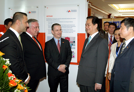 Thủ tướng Nguyễn Tấn Dũng và các đại biểu UAE tại khu giới thiệu các hoạt động trong lĩnh vực dầu khí của nước bạn.